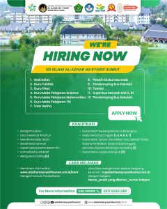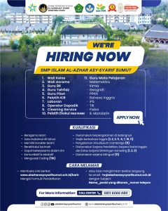 Inilah kesempatan emas bagi Anda yang ingin menjadi bagian dari lingkungan pendidikan Islam yang unggul, profesional, dan modern. Jika Anda memiliki semangat mendidik dan nilai-nilai Islami yang kuat, Al-Azhar Asy-Syarif Sumut adalah tempat yang tepat untuk berkarir dan bertumbuh.